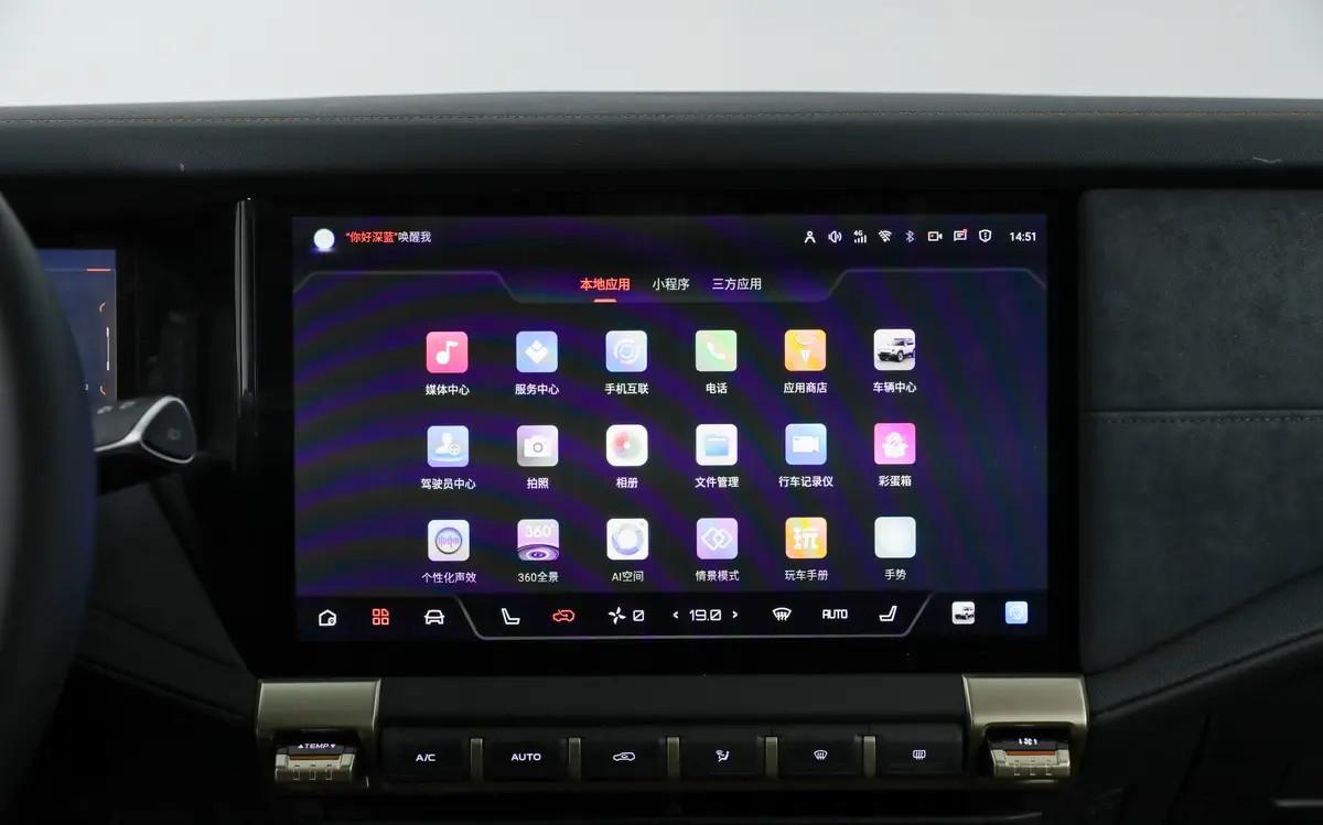 內飾方面,采用對稱“T”字形設計,中控臺設計得比較寬厚,并使用了不少粗壯的鍍鉻飾條,凸顯新車的硬核屬性。14.6英寸中控屏,看著大氣,內部集成了音樂、高德地圖、玩車手冊等應用,同時支持語音控制,基本符合主流車機水平。此外,在下方還保留了實體按鍵和撥桿,方便操控。方向盤采用三輻式設計,整體較為粗壯,真皮面料比較細膩,手感不錯,支持四向調節。
