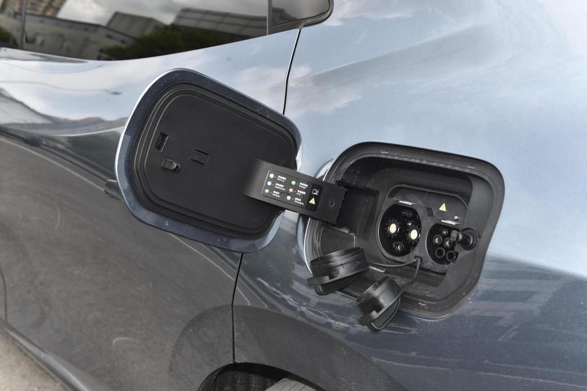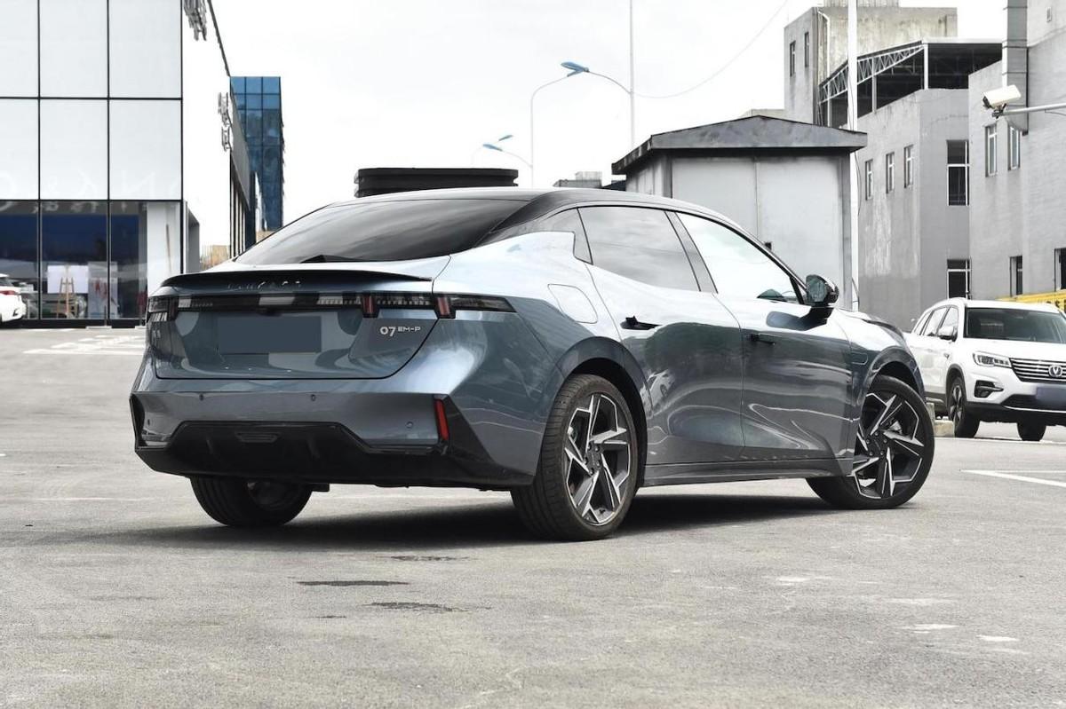 車身側面,黑色涂裝構成了懸浮式車頂結構,領克07 EM-P的腰線分為了上、下、后三段,上腰線會進入到C柱、進入到后風擋的下邊緣之中,下腰線會在側裙上方形成分散的夾角;而后腰線則是短短的一段,從尾燈出發,在油箱蓋附近消失。整個達到4827/1900/1480mm的車身帶有明顯的寬體效果,而2843mm的軸距不是最領先的,但卻也能保障視覺上的修長與座艙內的空間。