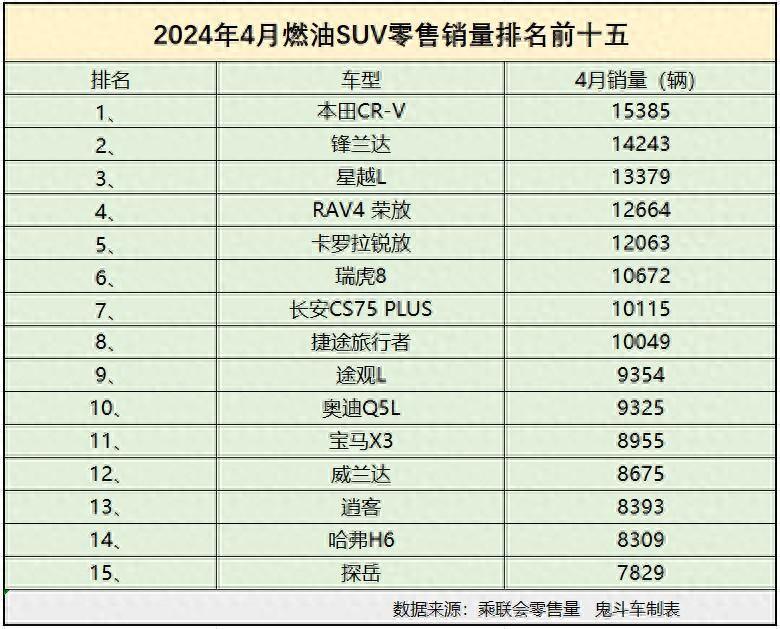 日前,乘聯會4月零售銷量數據出爐, 鬼哥根據燃油SUV零售銷量數據整理出排名前十五的榜單,接下來,看看哪些車型名列前茅?哪些車型銷量下滑明顯?