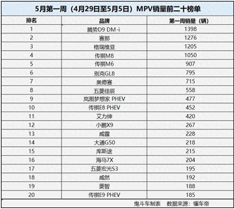 究其原因,很可能由于五一小長假所導致。那么,在五月第一周,哪些MPV車型銷量高,市場表現更出色呢?接下來,我們一同看看MPV市場5月第一周的銷量榜單。