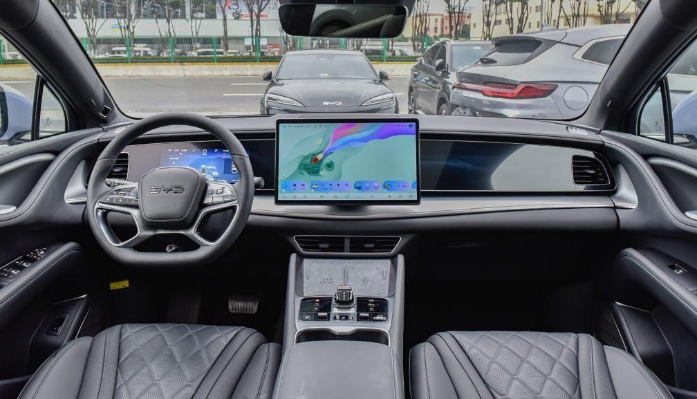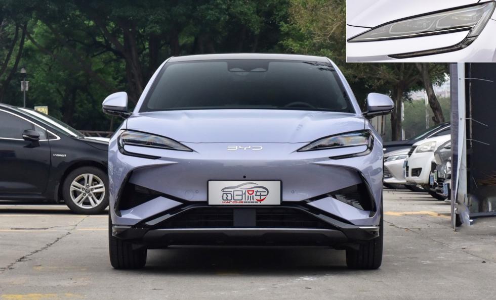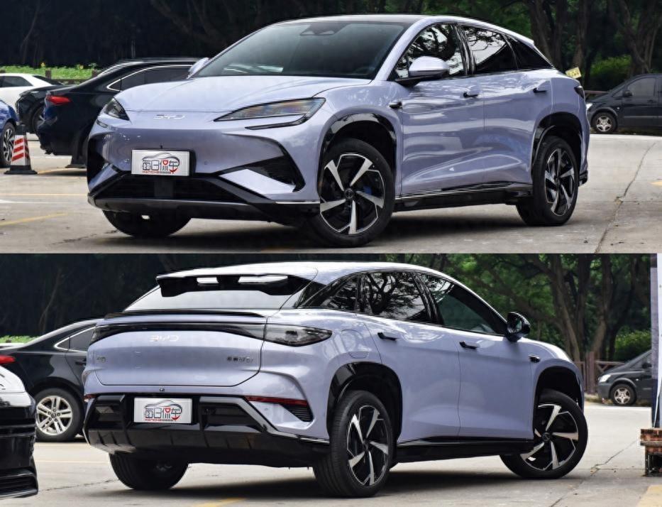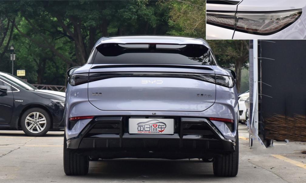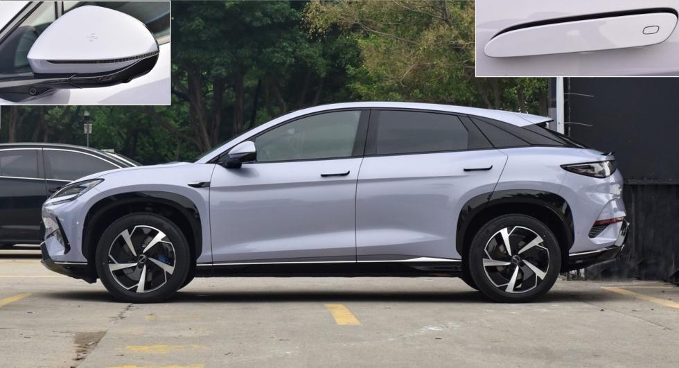 側面的轎跑造型很漂亮,得益于CTB電池車身一體化布局,車身高度做得比較低。相比宋L,它的底盤高度有所增加,車身高度增加了60mm,通過性更出色些。車頂下壓感出色,D柱的傾斜度很大,黑色涂裝營造出懸浮車頂。輪拱部分采用了方正的外拋造型和較粗的黑色輪眉,加上黑銀搭配的底裙,多少保留一些野性元素。雙色外后視鏡集成側轉燈、兩顆攝像頭和NFC鑰匙。采用整體隱藏彈出式門把手,前排都有無鑰匙進入。前排車窗標配多層隔音玻璃,后排標配隱私玻璃。