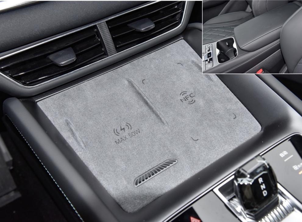 扶手臺前方有開放式雙手機位,左側帶50W無線充電和通風散熱,右側有NFC鑰匙。實體控制區中央是小尺寸水晶電子擋桿,占用空間不多,保留了一些常用功能實體按鍵。后方有開放式雙杯架,扶手箱容積夠大,下方懸浮空間也有一定儲物能力,海洋風格的水晶香氛布置于此。