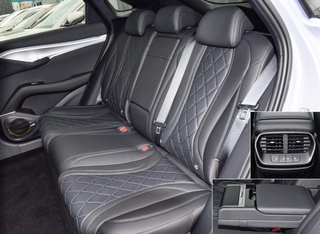 后排座椅與前排材質相同,與身體接觸部分有豐富的縫線,填充物厚實有彈性,坐墊長度充足,靠背與頭枕的側向支撐也不錯,靠背支持角度調節,還有通風加熱功能,對后排乘客的照顧更周到。空間方面,侃弟身高175cm,腿部空間三拳,頭頂一拳兩指,橫向充裕,地板全平。配置上,有地臺出風口、帶雙杯架和儲物格的翻折扶手,車頂有大尺寸全景天幕,可選裝電動遮陽簾。