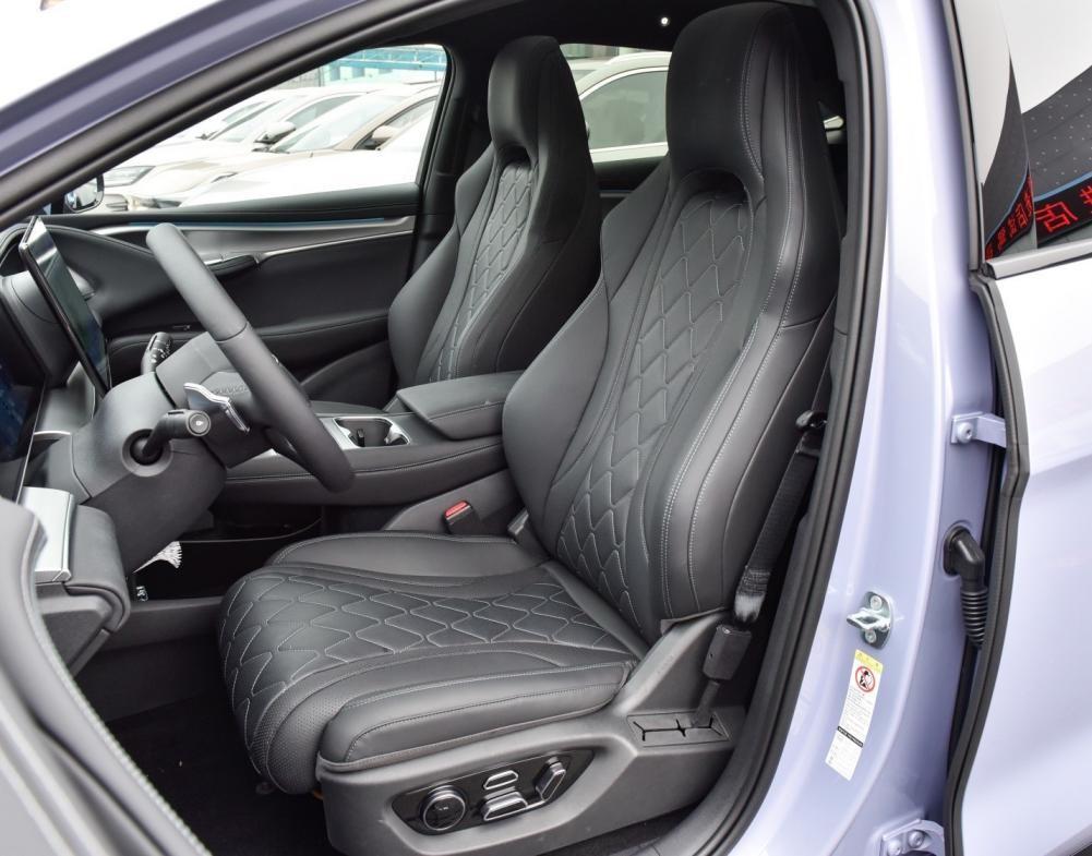 高配車型的一體化運動座椅是真皮材質,填充物相當厚實,形變量夠大,貼合感很好。坐墊長度很充分,帶內卷式電動腿托調節,靠背側向支撐比較到位,頭枕支撐性也足夠。前排座椅都提供4向腰撐調節和通風加熱功能,駕駛位帶記憶功能。
