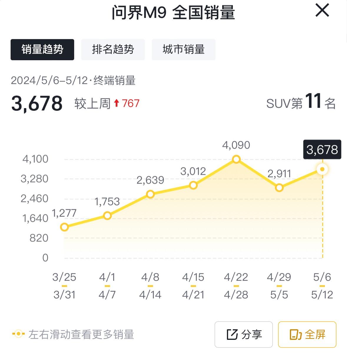 并且SUV前十強內(nèi),包括RAV4榮放、鋒蘭達、本田CR-V、卡羅拉銳放等合資SUV也基本集中在15萬級左右及其以內(nèi)的A級車市場。在中級和中大級市場,問界M9憑借3678輛的成績,排名整個SUV市場第11,值得注意的是,問界M9的售價還定位在45萬元以上。