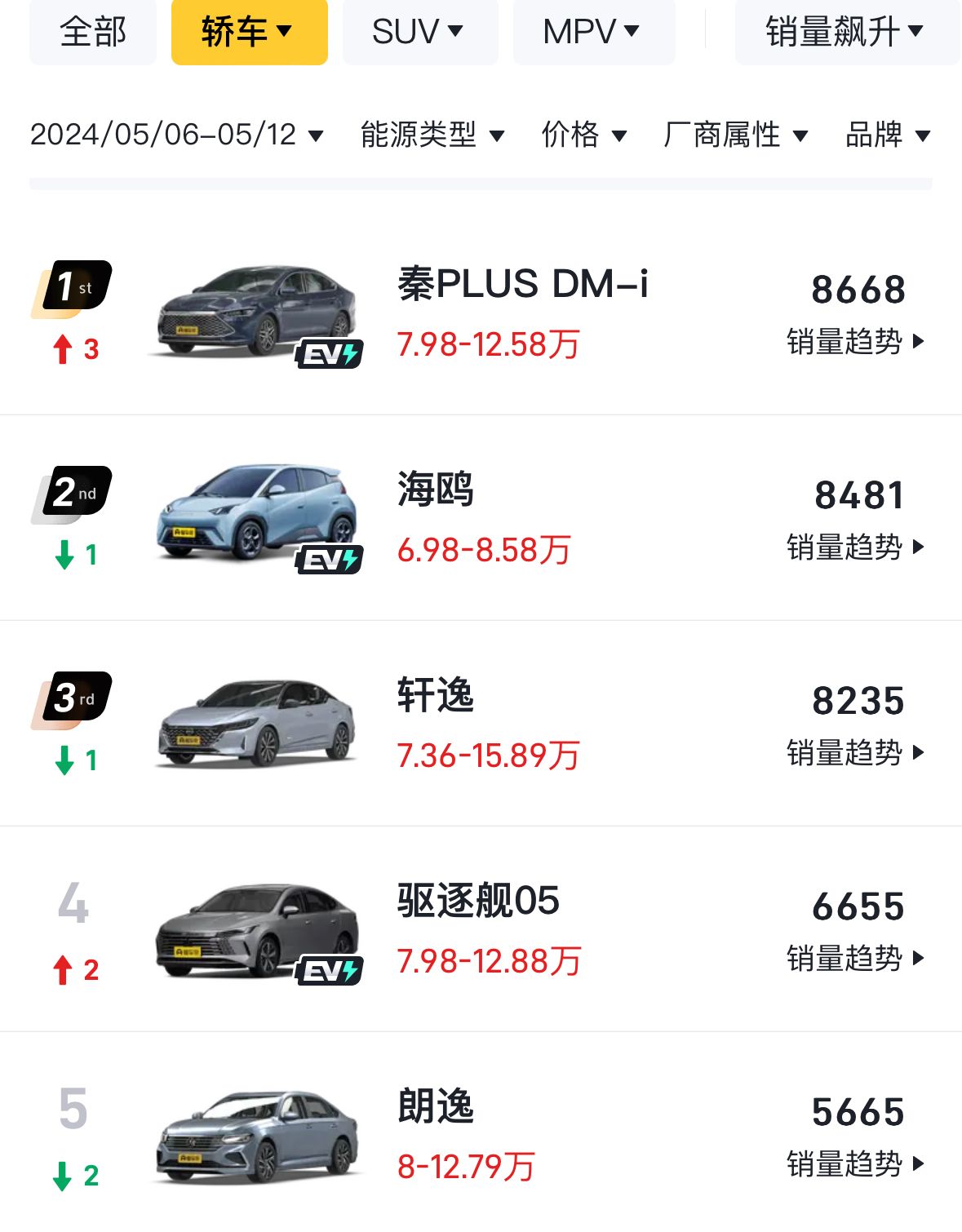 從具體的細(xì)分市場來看,各市場的內(nèi)部排名也出現(xiàn)了一些細(xì)微的變化。在轎車市場上,比亞迪秦PLUS DM-i就憑借8668輛的成績,重新奪回了轎車市場銷量冠軍,海鷗緊隨其后。驅(qū)逐艦05、秦PLUS EV不僅排名迎來了提升,而且兩款車型均創(chuàng)下了今年以來的周銷量最高記錄,分別取得了6655輛和5422輛的成績。