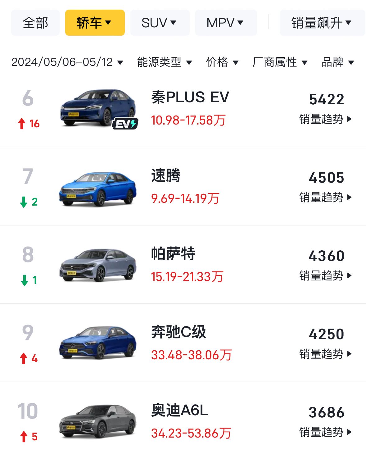 前十強內(nèi),除了比亞迪的四款熱門產(chǎn)品,其余車型也都是市場比較常見的熱門車型。其中軒逸、朗逸、速騰三款合資A級車仍然位居榜單中,而帕薩特則仍然是合資B級車市場的銷量冠軍,在豪華車市場上,奔馳C級和奧迪A6L在終端的大幅優(yōu)惠下,排名也在最新一周成功躋身前十。