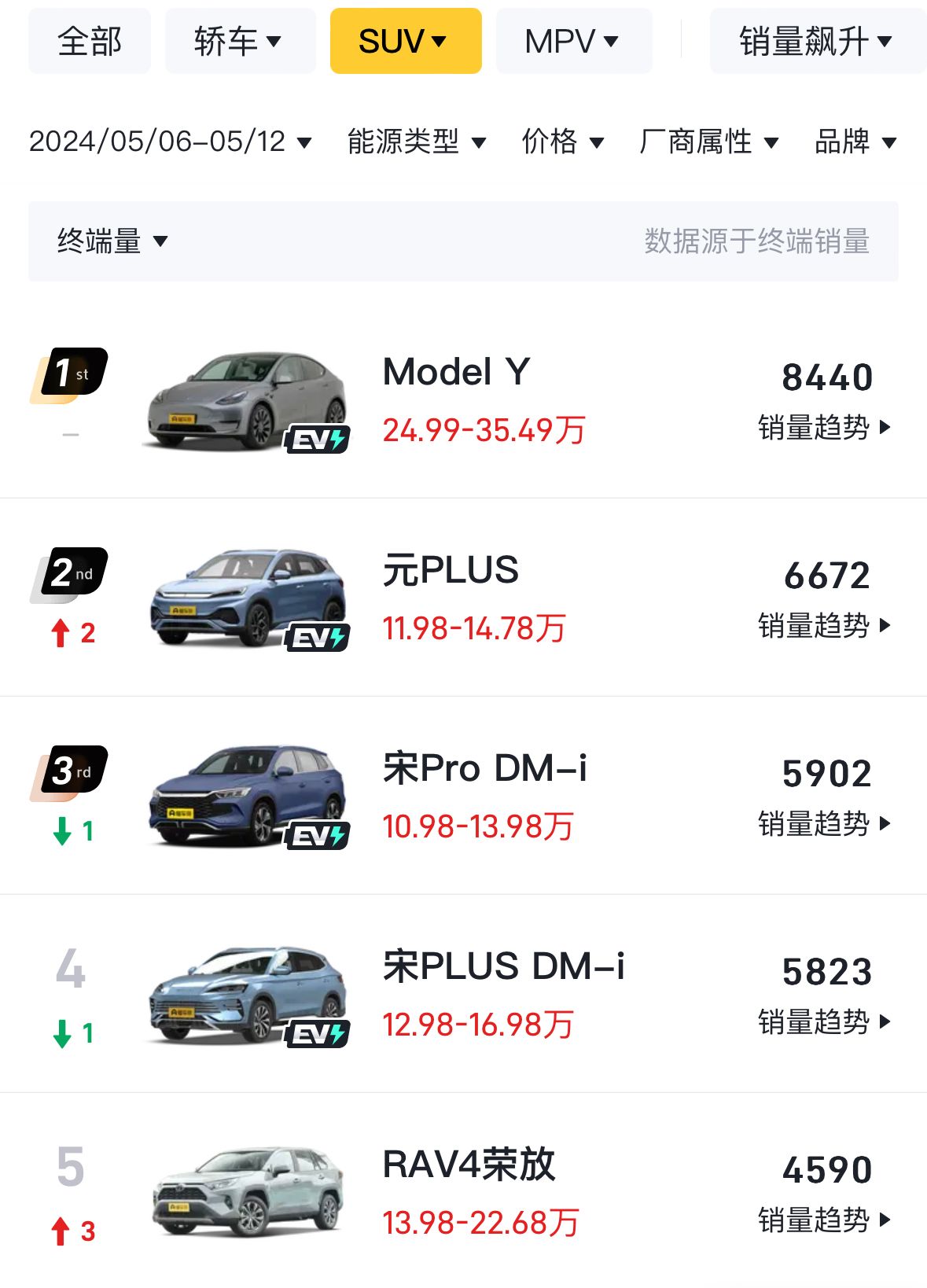 SUV市場上,“合資強,自主弱”的局面稍微有所緩解。在特斯拉Model Y仍然牢牢掌握著銷冠寶座的基礎(chǔ)上,除了元PLUS、宋Pro DM-i、宋PLUS DM-i,AION Y等自主新能源,吉利星越L仍然是榜單中的常見面孔,5月第2周取得了3766輛的成績。