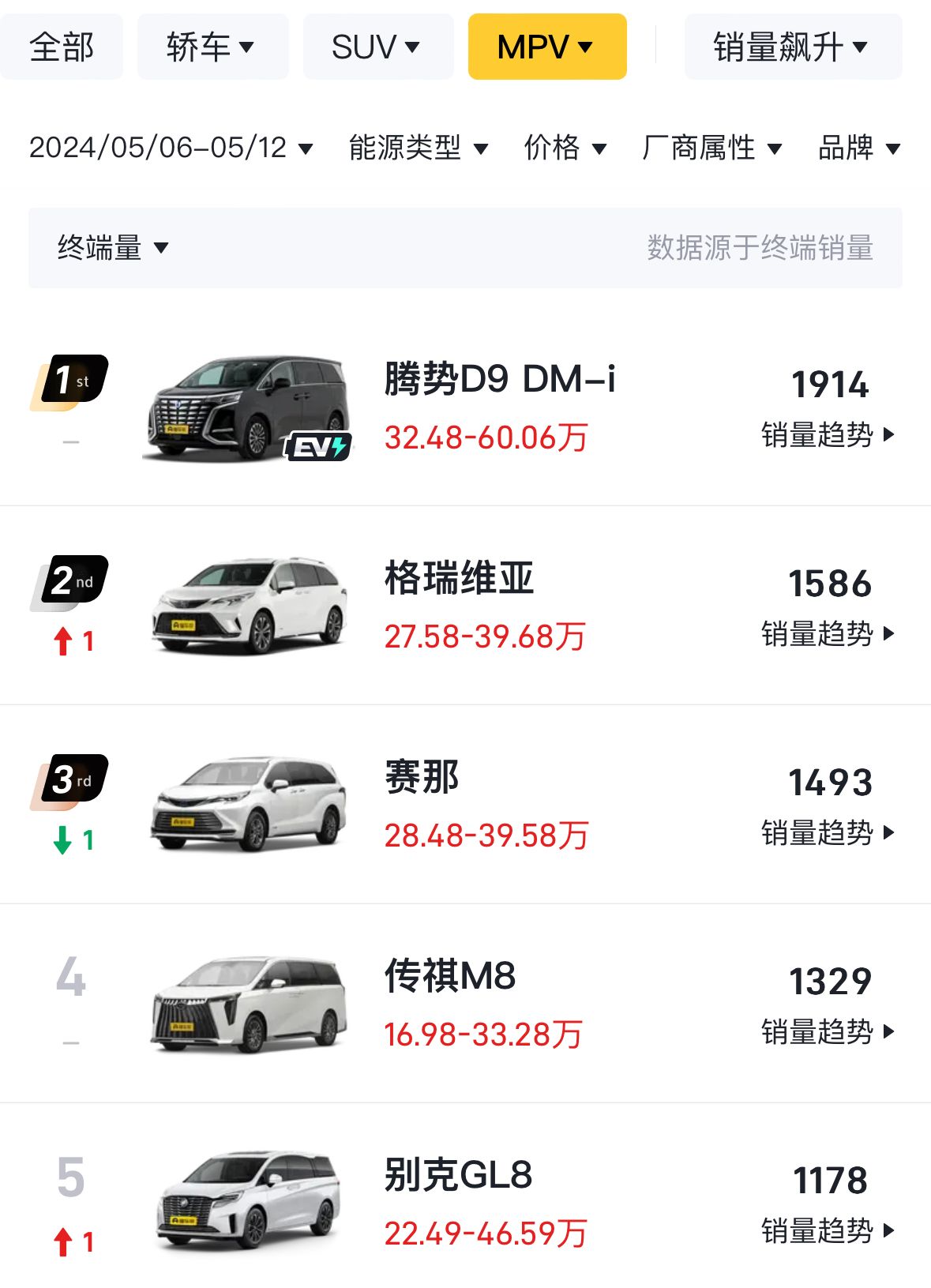 MPV市場方面,則相對較為較為穩(wěn)定,騰勢D9 DM-i仍然是MPV市場不可撼動的銷量冠軍,最新一周達到了1914輛的成績,別克GL8目前仍在前三強之外,周銷量成績?yōu)?178輛,排名MPV市場第五。此前別克GL8插混已經(jīng)上市,目前還暫未有關(guān)于插混版本的銷量記錄。
