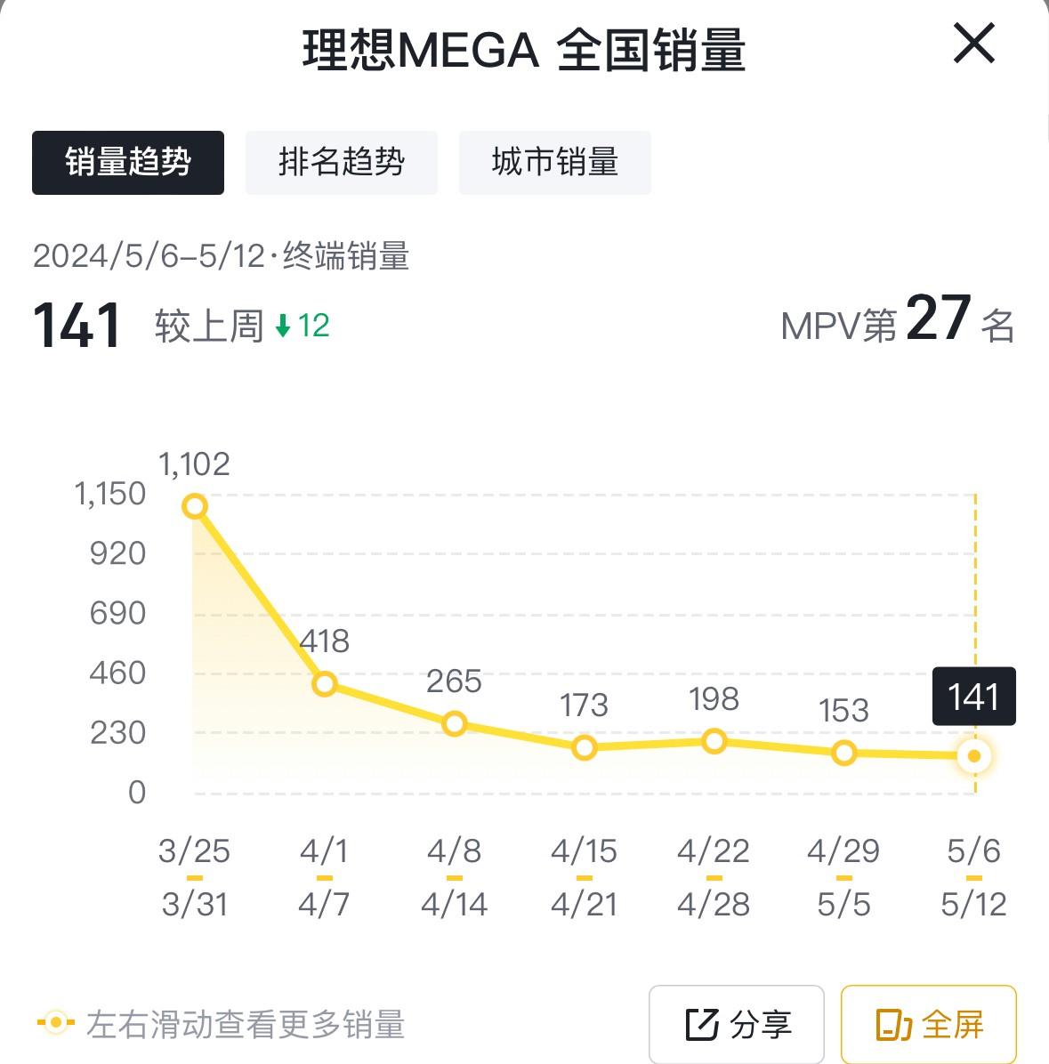 除了插混,細(xì)分到純電MPV的市場上來看,此前關(guān)注熱度較高的小鵬X9和理想MEGA目前的銷量仍然較為低迷,小鵬X9最新一周取得了365輛的成績,而理想MEGA一路下滑,最新周銷量僅為141臺。