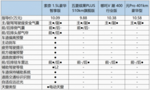 就拿幾款熱銷的新能源車,五菱繽果PLUS、哪吒V、元Pro來跟索奈對比,它們的售價幾乎是在同一區間。誰更值得買?比的就是配置。