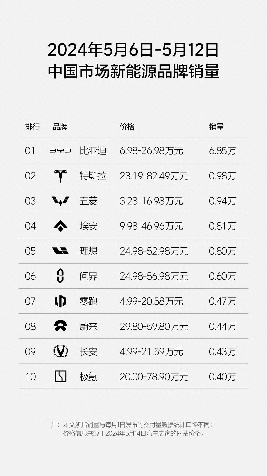 5月第2周銷量出爐:比亞迪6.85萬輛,理想0.8萬輛,小米0.11萬輛