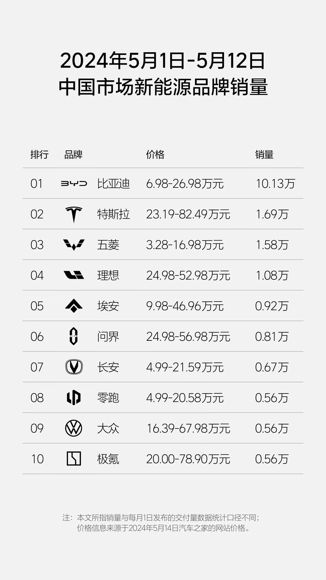 具體來看,作為新能源汽車市場斷檔式領(lǐng)先的存在,比亞迪第2周銷量達(dá)到了6.85萬輛。5月以來累計銷量是為10.13萬輛。從目前的銷量表現(xiàn)來看,伴隨著月中、月末迎來銷量沖刺,5月份,比亞迪月銷量再次超過30萬輛,基本沒有懸念。