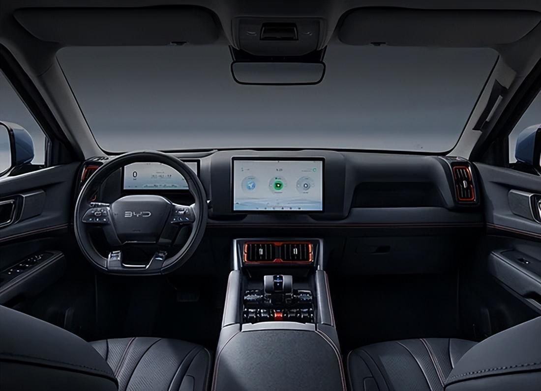 內飾方面,整體內飾采用類似于方程豹的內飾設計,中控臺采用10.25英寸全液晶儀表盤,搭配12.8英寸帶旋轉功能的中控屏,以及12英寸W-HUD抬頭顯示屏的設計布局。配置上,搭載比亞迪最新車機系統,支持地圖導航、540°全景影像、Apple CarPlay/Andriod Auto手機互聯、多媒體應用、應用商店、OTA升級等。