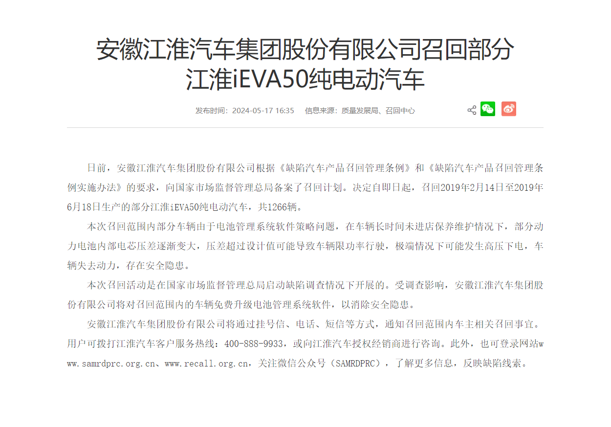 召回之后,江淮汽車將會為這些車型免費升級電池管理系統軟件,從而為用戶消除安全隱患。