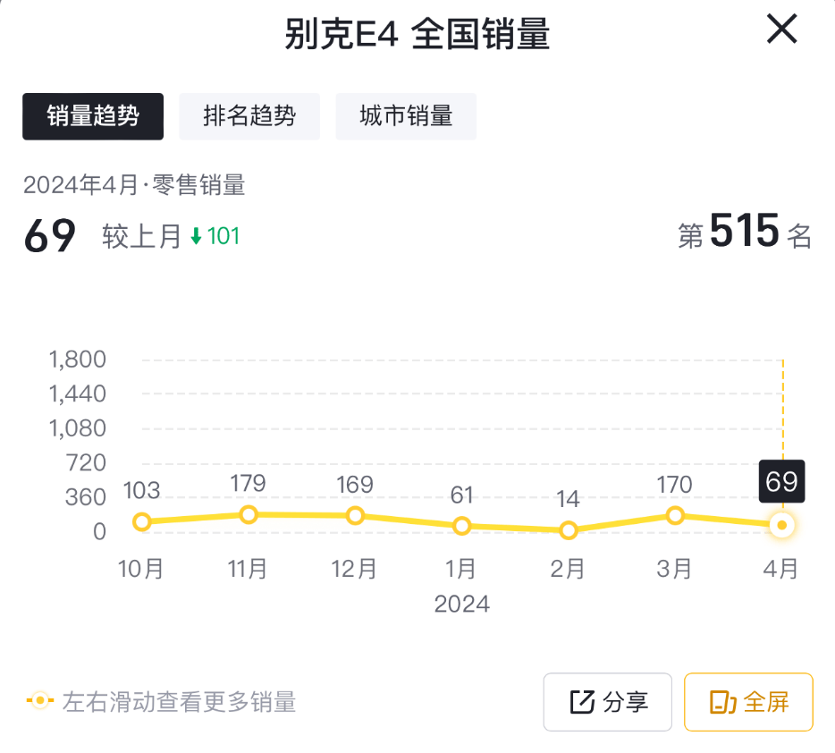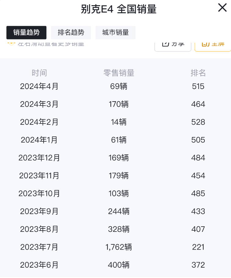 更讓人擔(dān)憂的是,從銷(xiāo)量規(guī)模上看,2024年4月份別克E4單月僅售69臺(tái)的銷(xiāo)量成績(jī),也確實(shí)過(guò)于低了點(diǎn)。