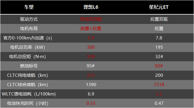 所以從動力性能上來看,四驅的理想L6的加速性能和脫困能力更強,而星紀元ET的綜合續航更遠,燃油經濟性更好。
