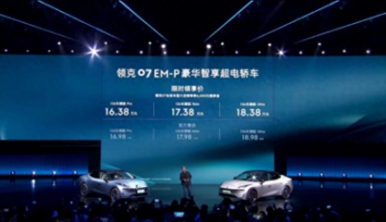 5月17日,領克07 EM-P正式上市,售價16.98-18.98萬元,并推出限時優惠6000元。新車基于CMA Evo架構打造,搭載了1.5T發動機+電機組成的插電混動系統,配備了魅族車機系統,最低饋電油耗4.8L/100km。