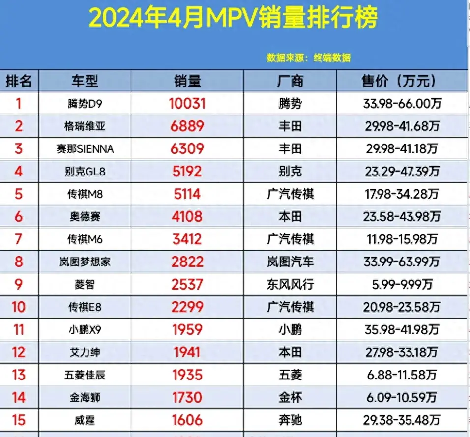 如果你還在猶豫選什么MPV,那么一定要關(guān)注我,帶你了解熱門(mén)MPV車型!最新2024年4月MPV銷量排行榜更新,幾家歡喜幾家愁,誰(shuí)才是最熱銷車型?我們一同看下:騰勢(shì)D9奪冠,別克GL8銷量下滑明顯,豐田格瑞維亞銷量首次進(jìn)入前二。