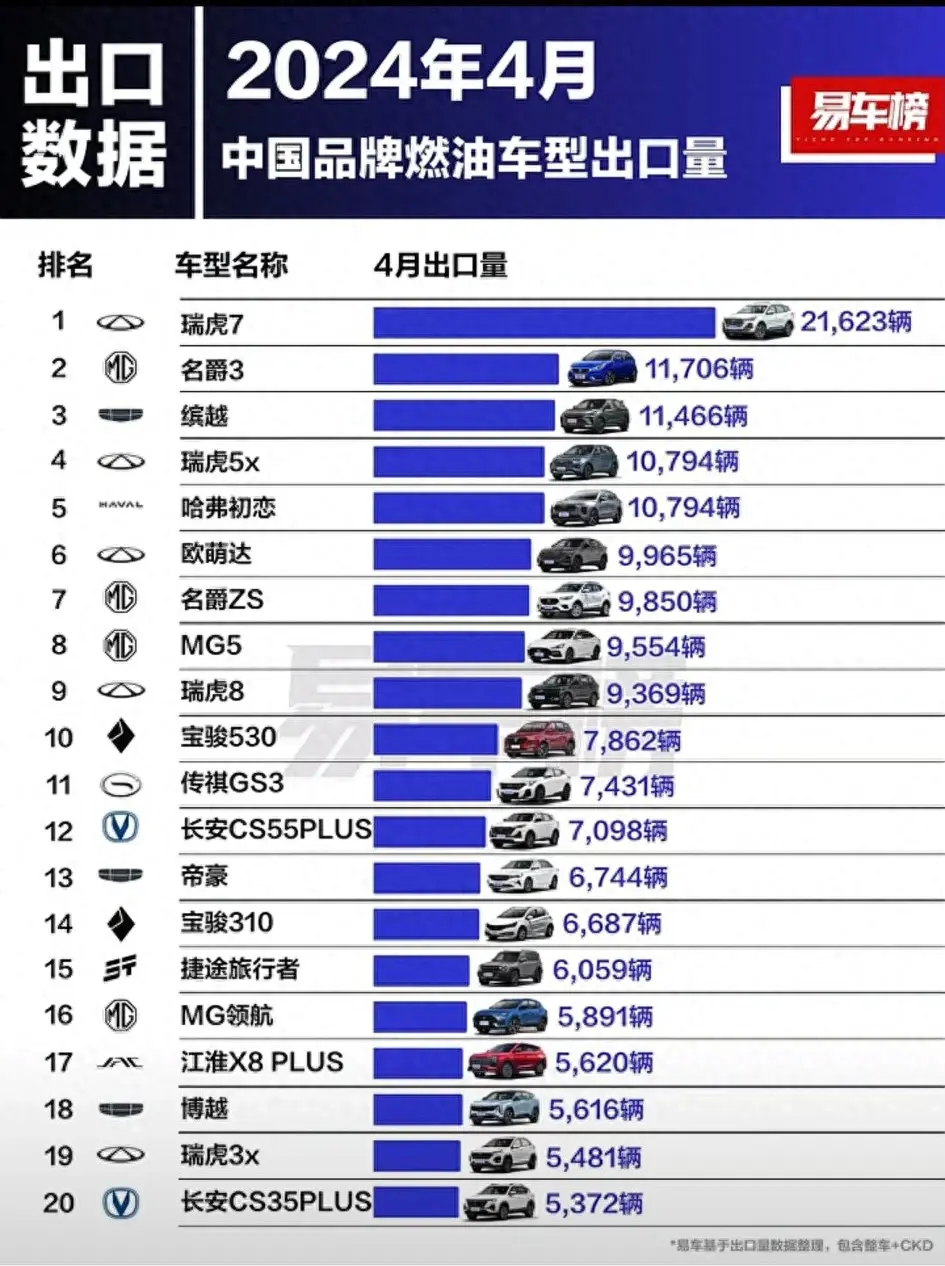 以前國產(chǎn)車一直不受國內(nèi)消費(fèi)者及國外消費(fèi)者待見,然而自2020以來,自主品牌發(fā)生翻天覆地質(zhì)變及量變,無論國內(nèi)外消費(fèi)者對國內(nèi)自主品牌認(rèn)可度有了很大提升。最新數(shù)據(jù)2024年4月中國品牌燃油車型出口量榜更新:瑞虎7 表現(xiàn)最佳出口2.1萬輛、名爵3 1.1萬輛、繽越、哈弗初戀均超 1萬輛。