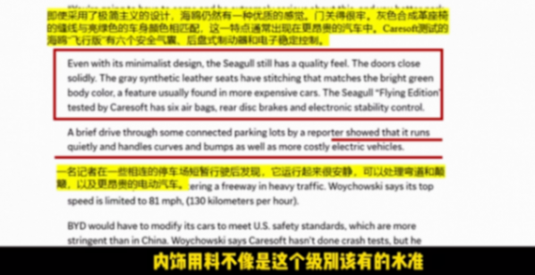 試駕、測試、拆解,一套流程走完,美國人對海鷗的結論是這樣的:內飾用料跨級、駕駛性能良好、工藝與美國電動汽車不相上下、價格只有美國同級別車型的三分之一。