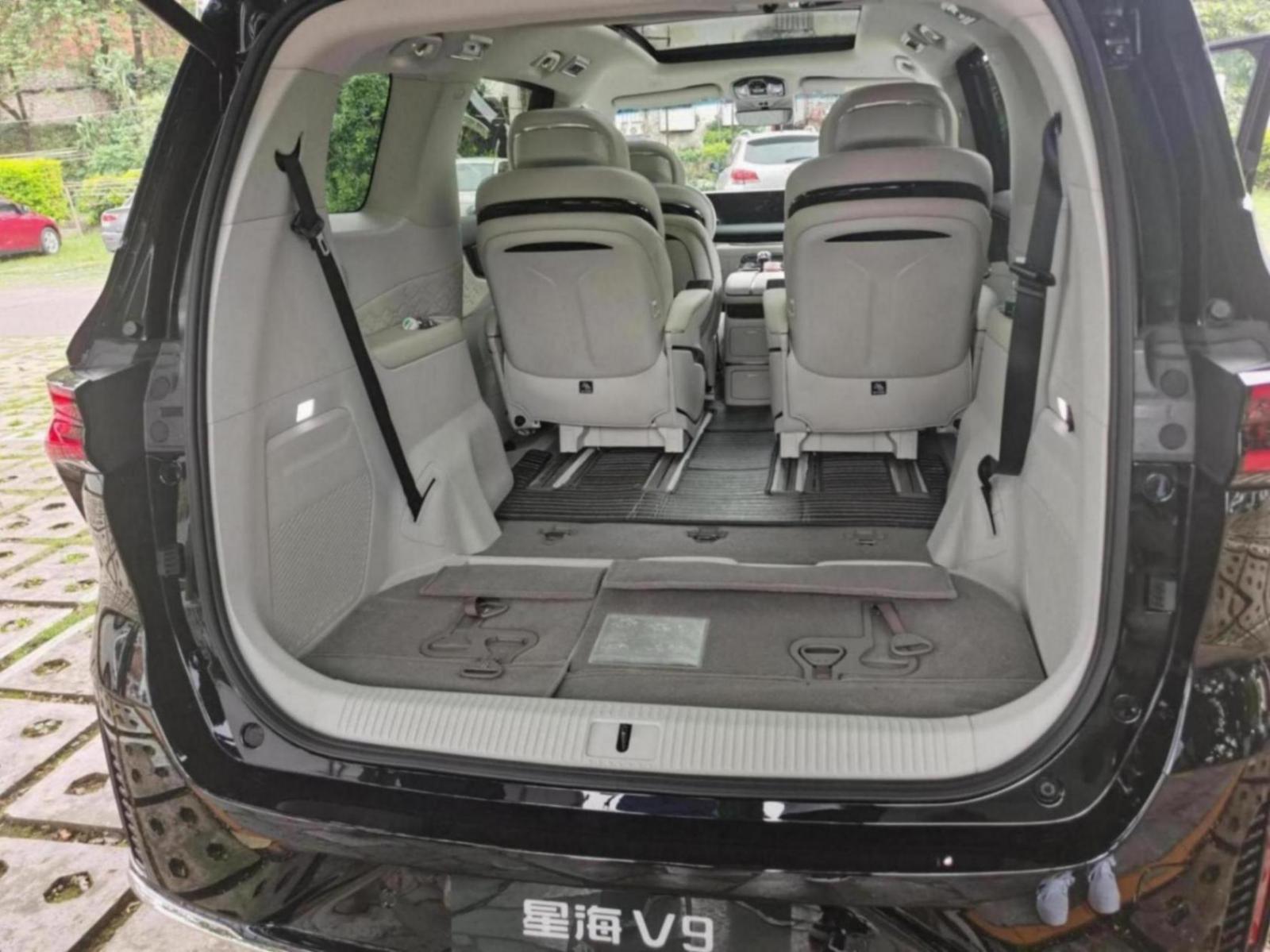 星海V9車身尺寸長寬高分別為5251*1920*1820mm,軸距為3018mm,實際體驗中,筆者1.71米的個子,在第一排調節到舒適的駕駛位置時,第二排調節到腿部空間有兩拳半的距離時,在第三排座椅上,筆者依舊有兩拳多的腿部空間,而頭部有一拳多的空間,并且第三排座椅靠背是可以調整角度的。至于車內的儲物空間也很豐富,完全不用擔心。在滿載的情況下,尾箱內還可以放下6個20英寸的行李箱。