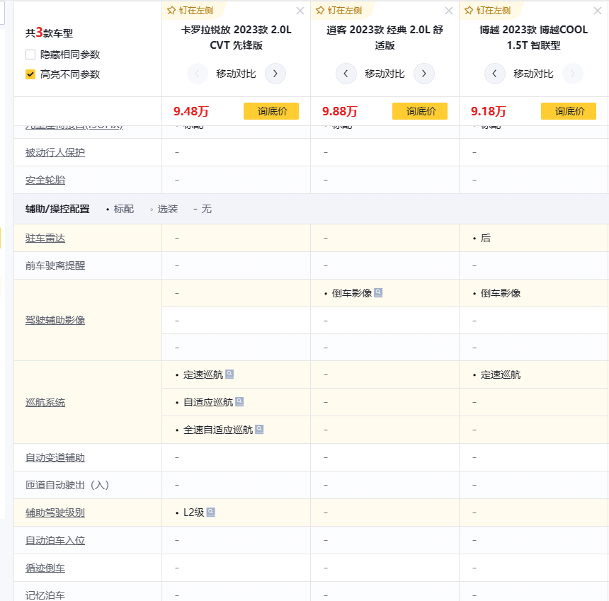 配置方面,卡羅拉銳放入門款就配備有L2級智駕輔助,而在10萬左右入門就配有L2級智駕的SUV車型在國內市場相對較少,例如對比逍客、博越等10萬級SUV入門款就可以發現,卡羅拉銳放的配置在同價位同級車中算得上是越級表現了。其中包含的疲勞駕駛提示、主動剎車、主動安全預警等功能,能夠有效的為駕駛提供輔助信息,讓行車更為便捷輕松。