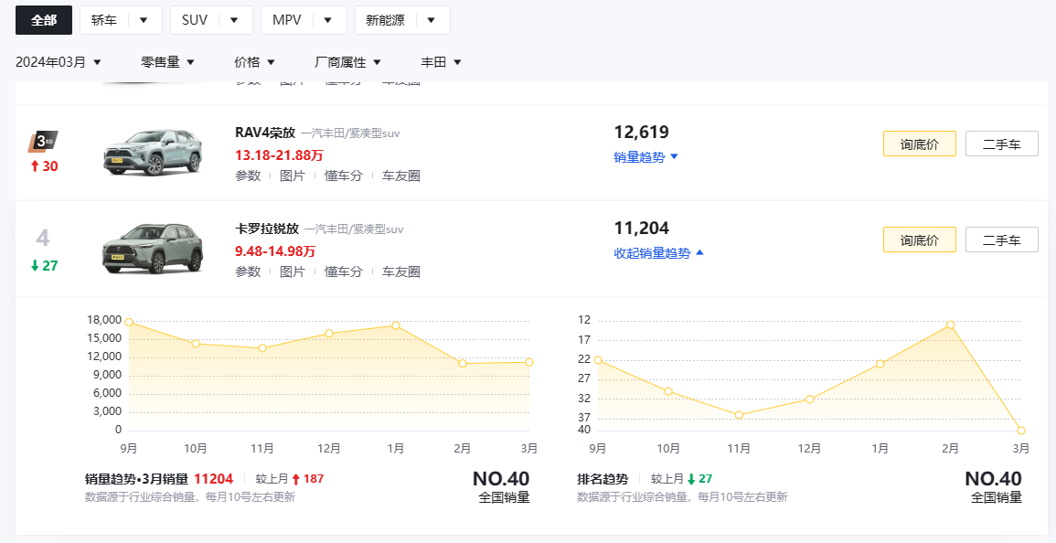 從懂車帝官方數據中可以發現,卡羅拉銳放近幾個月的銷量都穩定在月銷萬臺左右,可見在市場當中的基本盤還是比較扎實的。而此次卡羅拉銳放給到的降價優惠(活動詳情請咨詢當地經銷商),也是其面向國內家用SUV市場給出的進一步誠意。從家用角度來看,該車目前9.48萬——14.98萬的經銷商售價(山西忻州地區),結合標配的L2級智駕輔助、經濟的油耗等產品力,讓該車在競爭激烈的家用SUV市場中具有不低的性價比。如果近期有關注這款車的朋友,不妨去線下實際了解一下。