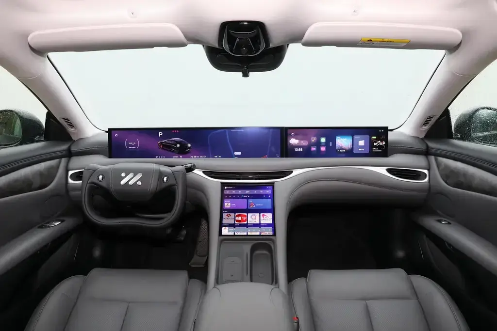 內飾方面,內飾大聯屏科技感突出,中控大屏尺寸26.3英寸,中控下屏尺寸10.5英寸,可選15.5英寸副駕駛屏幕。車機采用8295芯片,支持5G網聯,前后排語音控制等。車內雨夜模式,數字補盲和Carlog等功能也有一定的亮點。方向盤標配圓形方向盤。車內配備了21揚聲器音響,256色氛圍燈,主動降噪,不可開啟全景天窗,自動泊車,記憶泊車,循跡倒車,L2級駕駛輔助等。座椅采用仿皮材質,二排空間寬敞,前排座椅加熱和通風功能。主駕駛帶12向電動調節,副駕駛帶6向電動調節。后備箱常規容積457升,可擴展至1290升。
