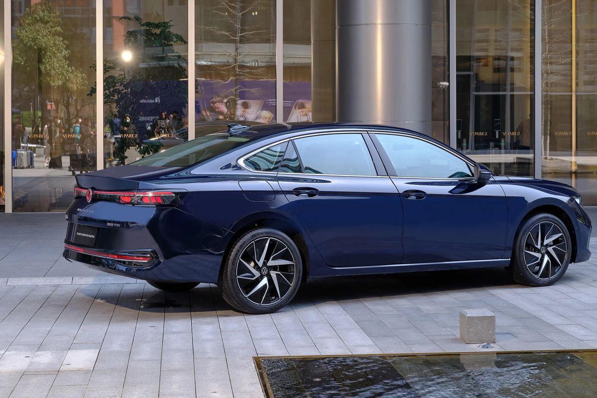 車身側面,全新一代邁騰的氣場更加強大,長寬高4990/1854/1487毫米,與現款長寬高4866/1832/1479毫米相比,可以說是得到了全面提升,但是軸距并無變化,依舊是2871毫米,但也保持著同級空間領先的水準;側面造型保持矯健姿態,硬朗鼻子的線條延續德系血統,19英寸多幅式輪轂運動感十足。