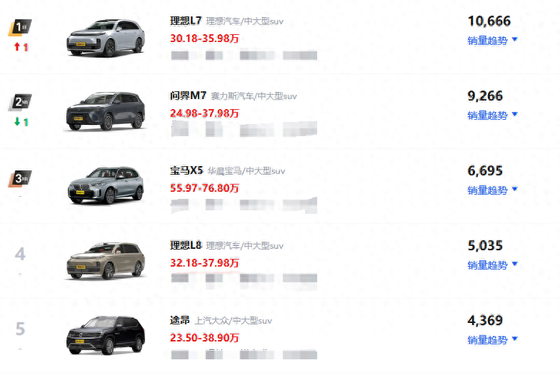 不得不說(shuō)理想4月份賣(mài)得不錯(cuò),重回中大型SUV排行榜首位,但并不是它支棱起來(lái)了,而是因?yàn)閱?wèn)界M7跌落神壇,從3月份18512臺(tái)到4月份9266臺(tái),少賣(mài)了大約一半。