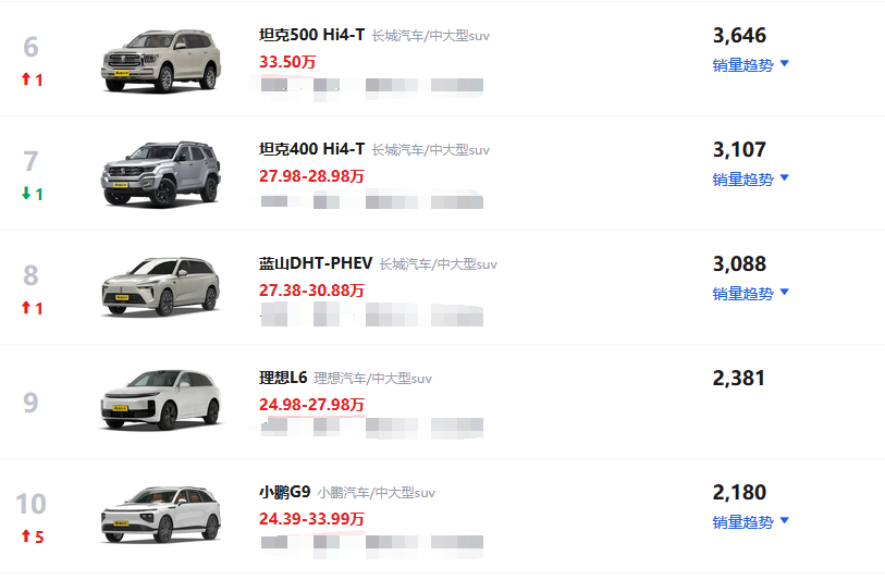 再往后的6-8名,被長(zhǎng)城系包圓,兩款坦克和一款魏牌插混能有三千多臺(tái)的銷(xiāo)量挺不容易的。