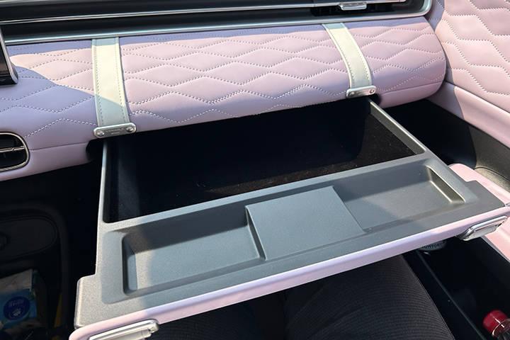 進入車內,我被那高質感菱格紋軟包內飾所包圍,精致松軟,包覆感強。抽屜式副駕島臺設計更是讓我眼前一亮,抽拉之間秒變化妝臺和辦公桌,無論是出行途中還是日常使用,都能滿足我的不同需求。這種設計不僅實用,還充滿了創意,讓我對東風納米01的好感度直線上升。