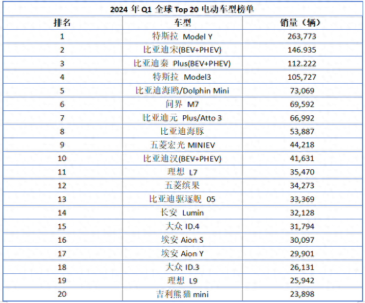其中,特斯拉Model Y還是很強,一季度銷量達到263773輛,穩坐第一,并與第二名的比亞迪宋拉開了較大差距,后者銷量為146935輛。不過比亞迪在數量上是最大贏家,一共有7款車型進入TOP 20,而且包括了定位較高的比亞迪漢。