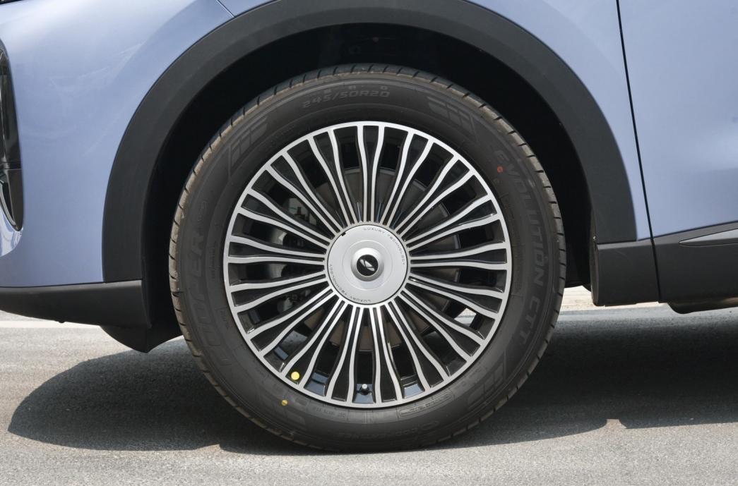 提供19英寸和20英寸兩種輪圈,這臺車是后者,密集細條幅造型有一定的高級感。輪胎規格為245/50 R20,胎寬合適,匹配固鉑Evolution CTT系列產品,有良好的干濕地抓地能力。