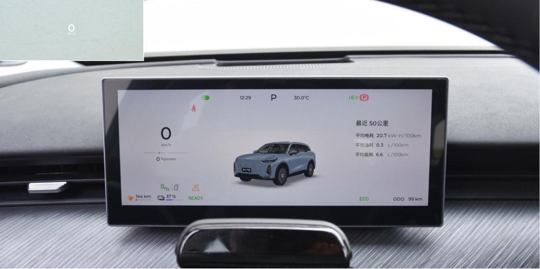 10.25英寸全液晶儀表屏采用當下流行的三區展示,中央是輔助行車信息,兩側以數字顯示為主,交互便利。這臺頂配車型是全系唯一提供高清HUD抬頭顯示的,可通過識別人臉自動調整高度,夠智能更方便。