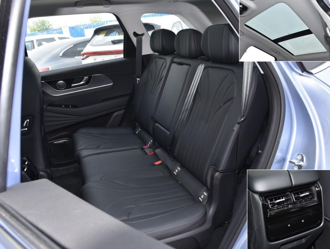 中排座椅坐墊長度充足,靠背支撐性也不錯,坐墊有160mm前后滑動范圍,適應性較高。空間方面,侃弟身高175cm,腿部最多有三拳多,頭頂一拳三指,橫向比較寬闊,乘坐三個大體型男士都沒問題。座椅有便利進出功能,一個動作同步前移和翻起,到后排很便利。配置方面,提供地臺出風口和后排獨立空調,還有老板鍵、中央可翻折扶手、車頂有大尺寸全景天窗帶電動遮陽簾。