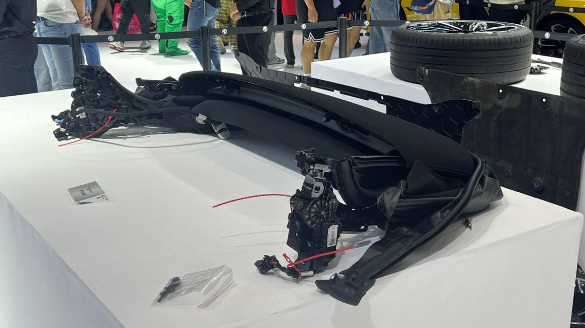 在現場,幾名工程師開始對Cyberster進行拆解,Cyberster的內部構造逐漸展現在大家面前。可以看到,車身結構設計得相當緊湊,各個部件之間的銜接也十分精密,敞篷剪刀門的設計確實很有個性,不僅外觀時尚,而且在實用性方面也做得很出色。