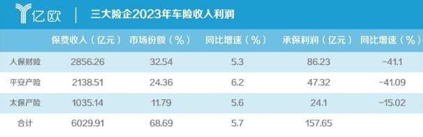 從數據來看,在2023年中保險三大巨頭,人保、平安和太平洋合計車險保費為60,029.91億元,占據全行業營收的68.67%,三家共盈利157.65億元。萬億市場,百億利潤,誰看了都得眼紅。