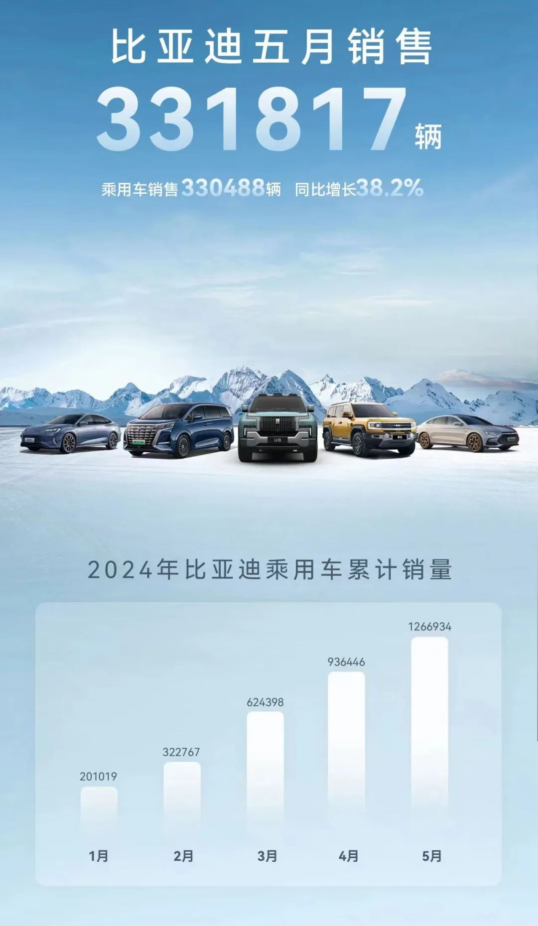 先說比亞迪,5月銷量為331817輛,同比增長38.2%,創(chuàng)下了年內新高;從1-5月來看,累計銷量已經超過了126萬輛。
