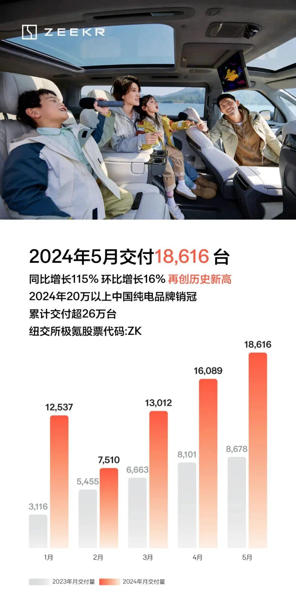 小米汽車,5月銷量為8630輛。沒人再質疑其十萬定單了,懂得都懂,目前限制小米銷量的,只有產能了。于是,雷軍在最近回應,小米汽車工廠6月開啟雙班制,確保當月交付1萬輛。全年將至少交付10萬輛,同時會進一步沖刺12萬輛交付。另外,隨著產能爬坡,小米SU7的鎖單期也縮短了。2024年回頭看,小米也可能是最大的贏家。