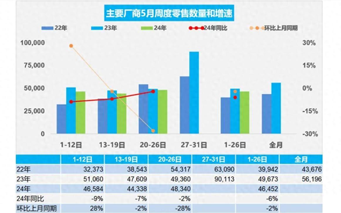 根據中國汽車流通協會近期發布的相關銷量數據顯示,今年5月1-26日,我國乘用車市場零售為120.8萬輛,同比去年同期下降6%,較上月同期下降2%。同期,新能源車市場零售57.4萬輛,同比去年增長27%,較上月同期增長2%。