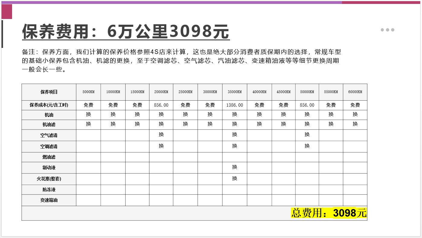 保養層面,我們按照一年2萬公里的里程計算,6萬公里來計算總的保養支出。根據官方保養政策,吉利ICON在5000km時進行首保,免費更換機油、機濾,此后的保養周期同樣為5000km,略顯頻繁。最終,我們大致算了一下,6萬公里保養費用是3098元,1年2萬公里的保養成本為1032元左右。