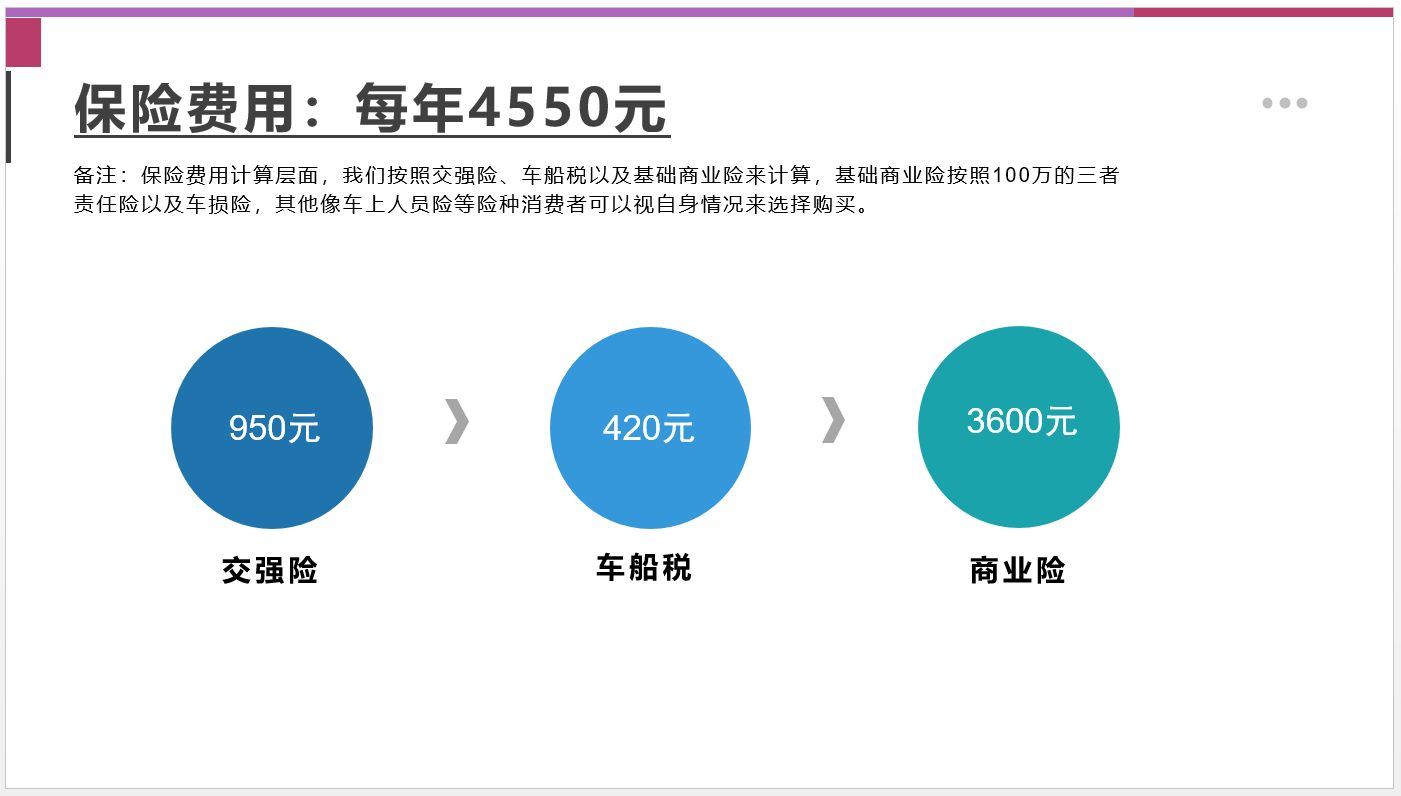 保險費用計算層面,我們按照交強險、車船稅以及基礎商業險來計算,基礎商業險按照100萬的三者責任險以及車損險,其他像車上人員險等險種消費者可以視自身情況來選擇購買。我們的價格不考慮多年不出險的市場折扣價。