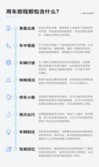 所謂旅程維度,即從出行規劃的“準備出發”階段開始,到出行旅程結束后的“駕乘回憶”階段,將用戶出行的相關用車場景,通過“旅程”由點串成的線。同時將功能體驗融入到場景中,并解析其帶來的用戶價值。