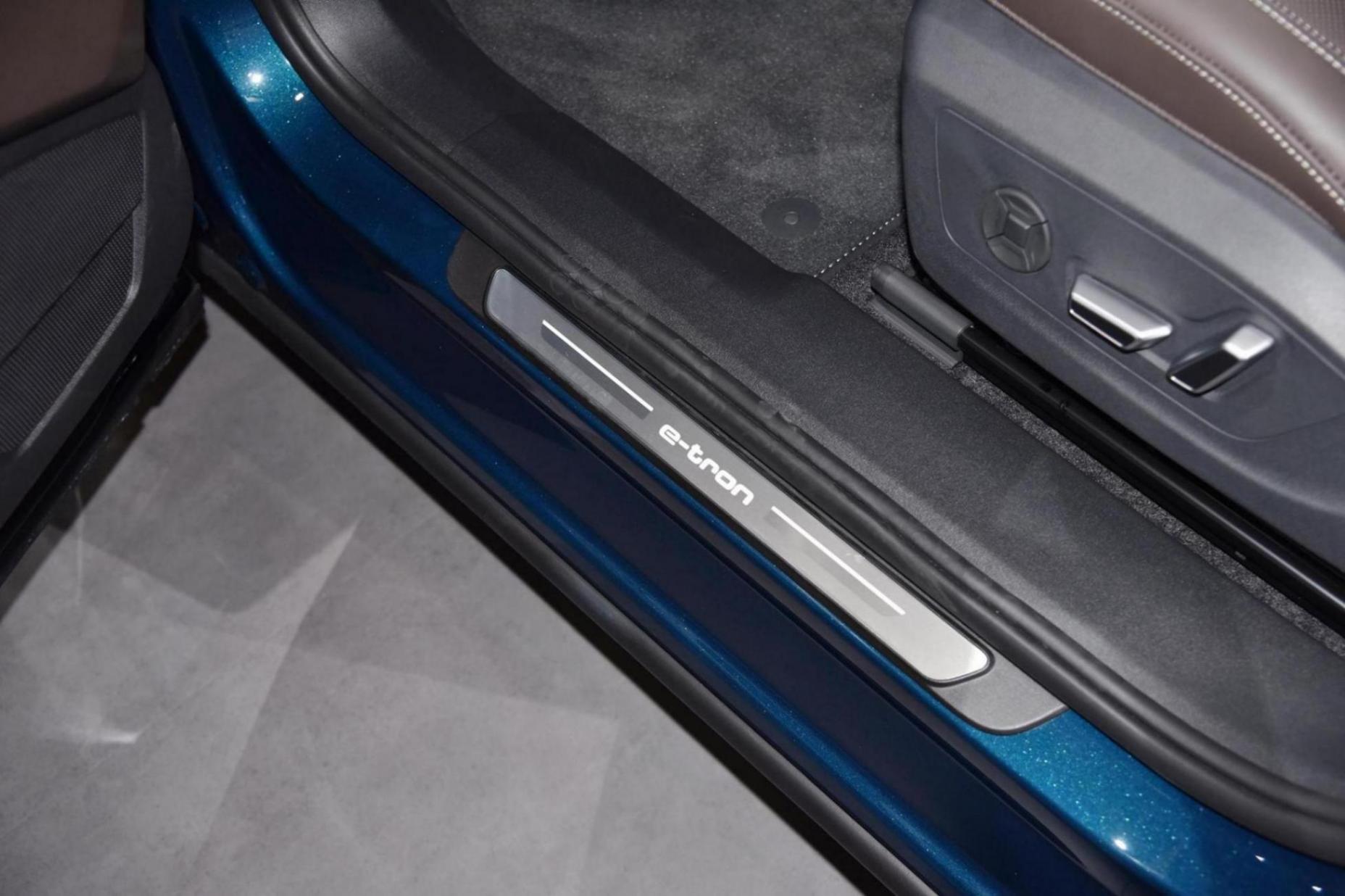 側面,腰線干凈利落,腰身加以內凹處理,造型經典。前后輪眉鼓起,所配的防撞條與裙邊黑色飾條銜接,形成懸浮式車身。在后視鏡下端配置迎賓光束,只要打開車門地面映射出e-tron的字樣。