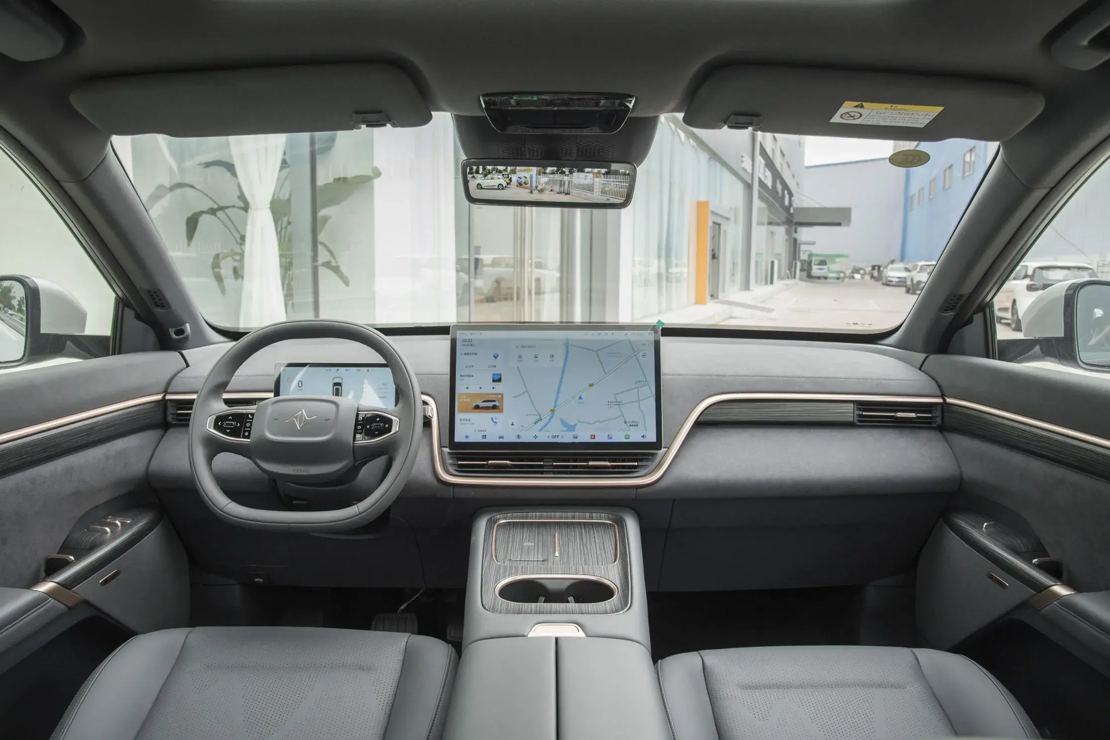 內飾部分,整體采用淺灰色調,搭配貫穿式金屬飾條,在中央扶手區域添加了木紋材質,看上去比較低調奢華。中部有一塊15.6英寸懸浮式的車機屏幕,尺寸較大,左側帶有全液晶儀表盤和雙幅式方向盤。臺面下層以及兩側車門內飾板帶有翻毛皮材質,車內的檔次進一步提升。車機芯片為高通驍龍8155,預計會有不錯的車機反應速度。