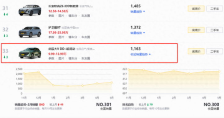 啟辰大V DD-i是一款緊湊型SUV,目前有4個版本配置,官方指導價從11.89萬元至14.99萬元不等,定價剛好處在競爭激烈的10-15萬元之間。根據官方給出的汽車銷量排行榜來看,該款車的月銷量基本維持在1000+臺左右,成績較為普通,因此為了刺激消費,該款車在經銷商處也有不同程度的價格下調,在我國大部分城市,啟辰大V DD-i超混動 60KM iD版的價格已經下調至9.99萬元,進一步拉低了人們的入門門檻。