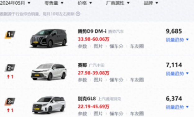 前三名分別是騰勢D9 DM-i(9685輛)、豐田賽那(7114輛)和別克GL8(6374輛),騰勢D9 DM-i在3-5月份始終保持著九千多的銷量,似乎遇到了上漲瓶頸,反而是賽那開始發力,如果算上格瑞維亞(4929輛),豐田系MPV總量已經突破1.2萬輛;略感惋惜的是GL8,在4月份推出插混版之后,似乎并未對銷量產生積極影響。