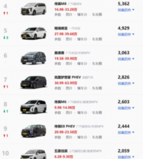第四名到第十名當中,傳祺M8(5362輛)和傳祺M6(2603輛)表現都不理想,傳祺M6甚至創下近半年來月銷量新低,主要是同價位可以有很多SUV選項,論空間、通過性都比它強;奧德賽銷售3063輛,二季度表現稍微好了點,但艾力紳直接跌出前十名了。